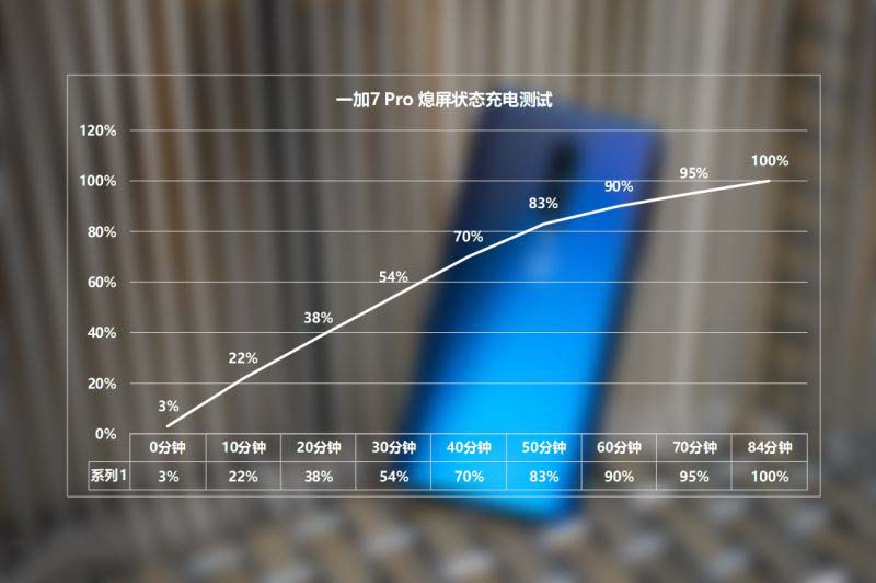 在快速充电方面,一加7 Pro延续了一加6T迈凯伦定制版上的Warp 闪充技术,最大输出功率为30W(5V/6A)。在熄屏状态下进行充电,30分钟充电54%,1小时充电90%,完全充满需要84分钟,快充速度在2019年旗舰手机中属于第一梯队。