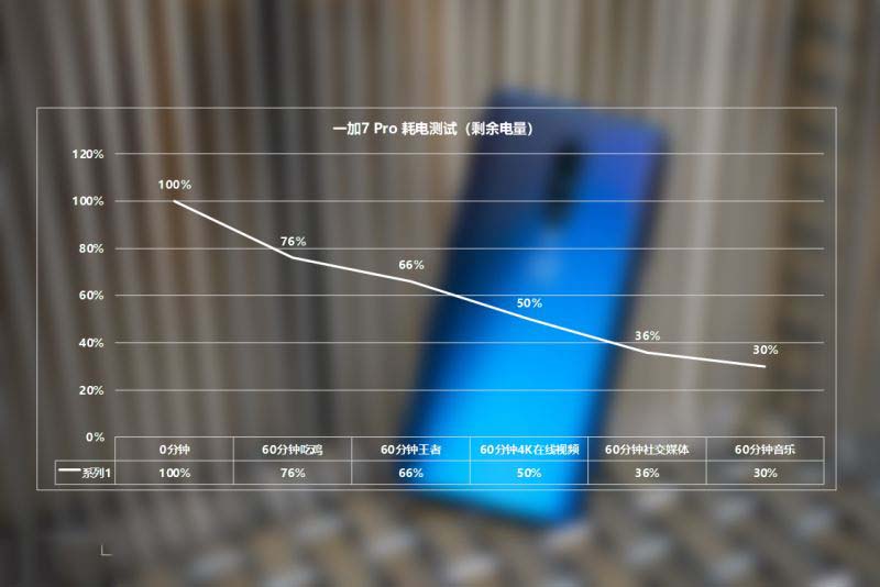 续航方面,一加7 Pro内置了一块4000mAh电池,我们对它分别进行1小时《和平精英》、1小时《王者荣耀》、1小时在线4K视频播放、1小时微博微信社交媒体、1小时在线音乐播放总共5小时的常规续航测试。最后一加7 Pro剩余电量为30%,其中1小时大型游戏《和平精英》(破解60帧)耗电最大,达到24%。相比市面上采用1080P分辨率的手机来说,一加7 Pro 上的这块2K+屏幕确实会更耗电一些,但是对于绝大多数用户来说,一天一充问题不大。