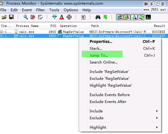 4、完成以上操作后,我们再去打开calc.exe,并将标准型切换成科学型,便可以从process monitor中看到相应注册表项了,选择jump to便可打开到相应的注册表项