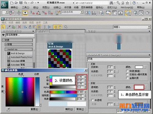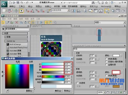 (7)接下来需要对玻璃的颜色进行编辑,设置“折射”选项组内“颜色”显示窗内的颜色。