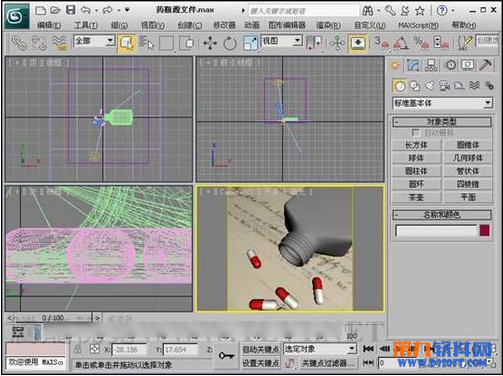 (1)运行3ds Max 2011,打开素材文件“药瓶源文件。max”。