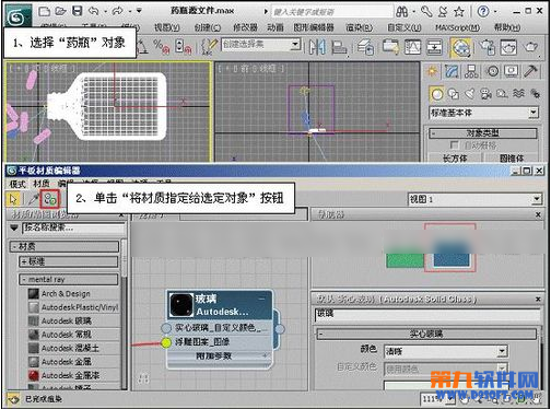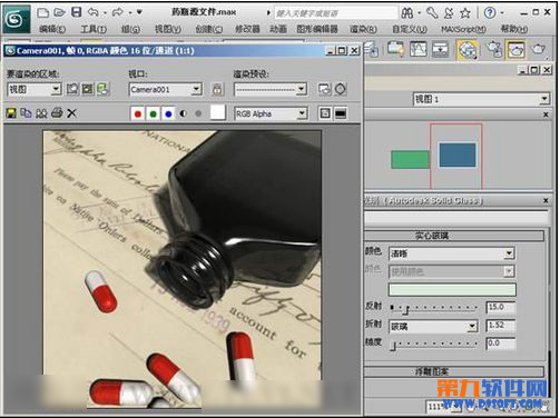 (4)将“玻璃”材质赋予场景中的“药瓶”对象。