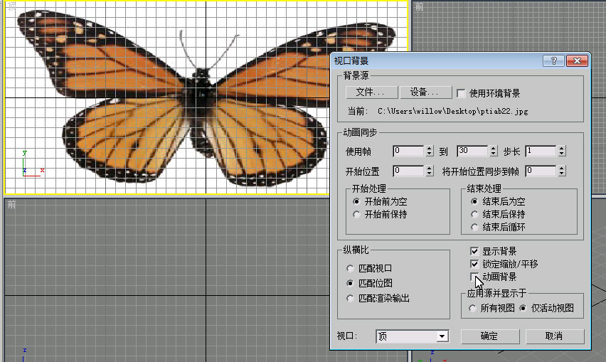 2. 启动max,按ALT+B键打开视口背景对话框,选择蝴蝶素材作为顶视图视口背景。如图勾选下面选项