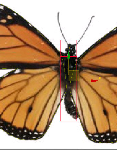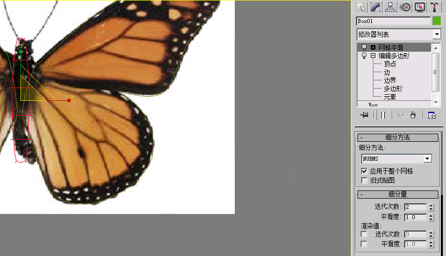 7.接下来绘制蝴蝶身体部分。创建一个大小跟素材类似的长方体,长度分段调为5,,如图所示