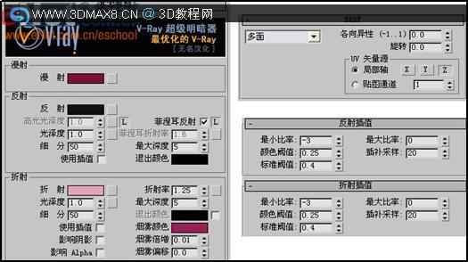 3、选择第二个样球,点击“standard”按钮,在打开的“材质/贴图浏览器”面板中,双击右栏中的“VrayMtl”项,并进入其属性面板,修改相关值,如图9所示。