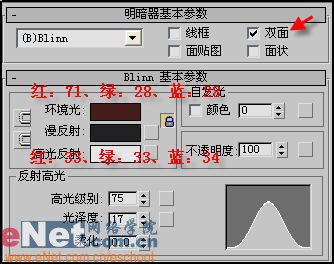 2、打开“Blinn基本参数”卷展栏,调整漫反射 颜色、反射高光值等参数,如图8所示。