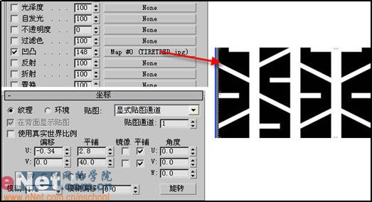 1、点击工具栏上的“材质编辑器”按钮,打开其面板,选择第一个样球,打开“贴图”卷展栏,单击“凹凸”后的“none”按钮,打开“材质/贴图浏览器”面板,选择“新建”单选项,然后在左边列表中双击“位图”贴图,为它指定一张轮胎痕迹的贴图,如图7所示。