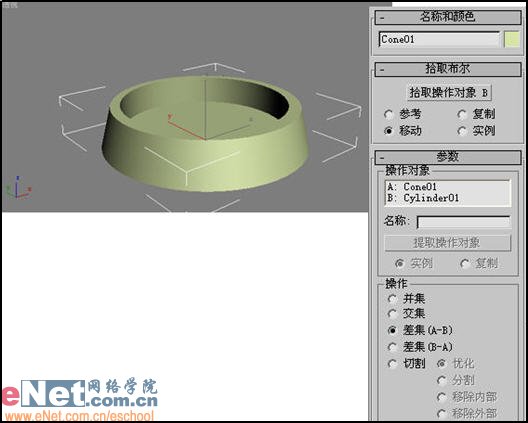 5、选择Cone01,在“几何体”创建命令面板中,选择下拉列表框中的“复合对象”项,进入复合物体创建面板。单击“布尔”按钮,打开布尔操作属性面板,单击“拾取操作对象B”按钮,将鼠标指针移到Cylinder01上,单击鼠标左键,二者相交的部分均被减去,得到一复合Cone01,如图5所示。