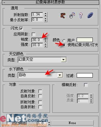 5、打开材质编辑器,调整“幻景海浪材质参数”卷展栏下的“闪光锐度”、颜色选项、水下颜色类型等定义,如图7所示。