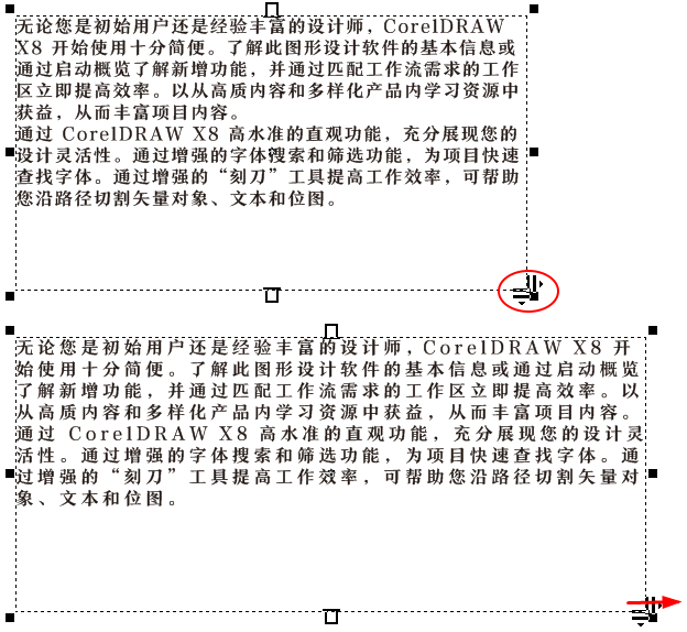 输入段落文字之后,使用“文本工具”在文字任意地方单击,在文本框右下角会出现两个控制符号,拖动“向右”的控制符可以调整文本的字间距。