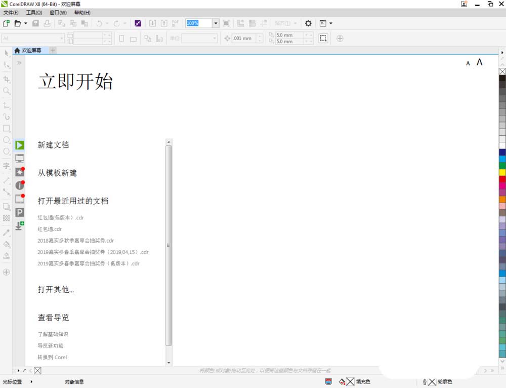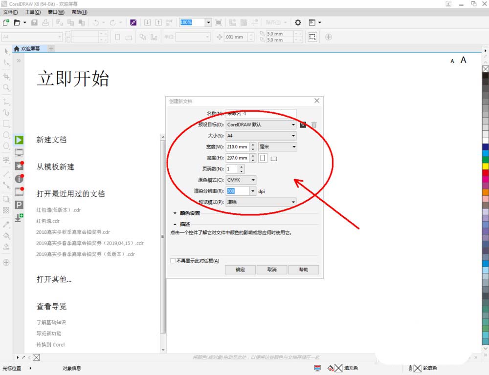 1、打开CorelDRAW X8 软件,点击【新建文档】,按图示参数新建一个cdr文档(如图所示);
