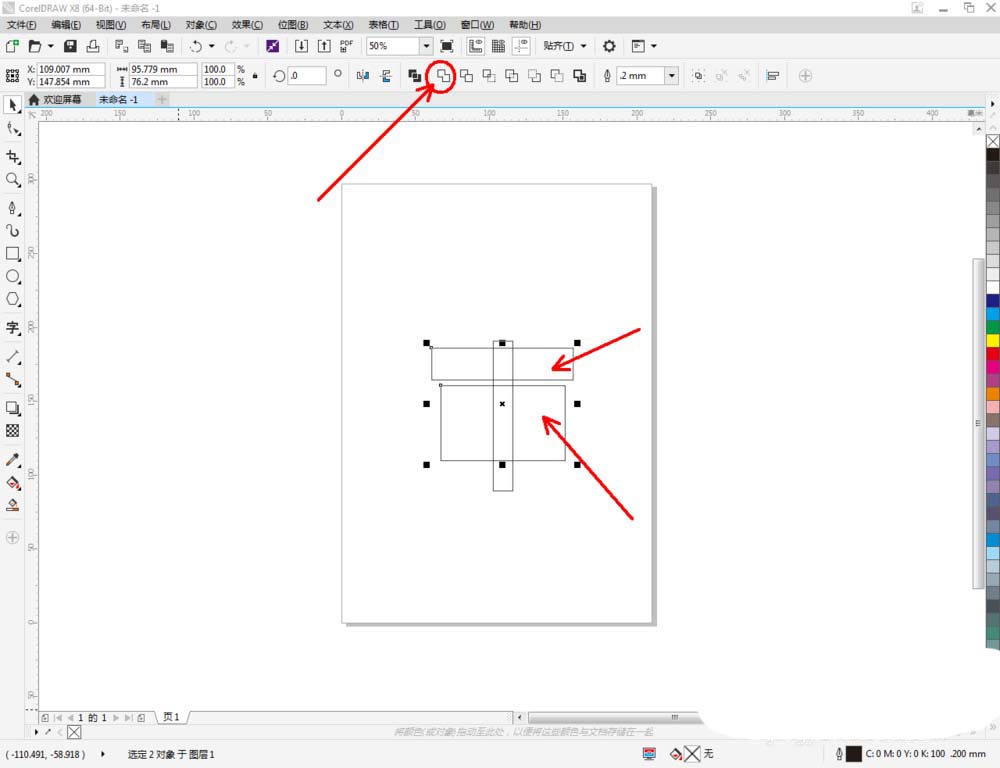 3、点击【选择工具】选中图示两个横向矩形图案后,点击【合并】将两个图案合并为一体。完成后,选中所有图案,点击【移除前面对象】将前面的竖向矩形图案部分移除(如图所示);
