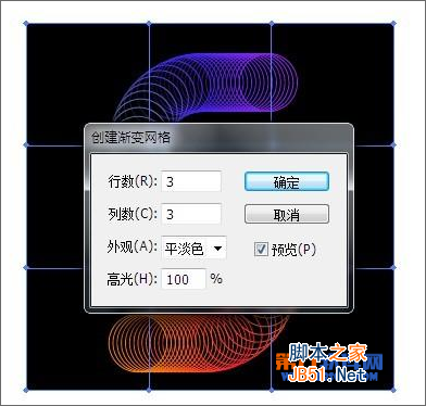添加一些灯光效果。 选择黑色的正方形,然后去到对象>创建渐变网格,并设置对话框中的行和列的数量。(解锁黑色正方形Ctrl+Alt+2)