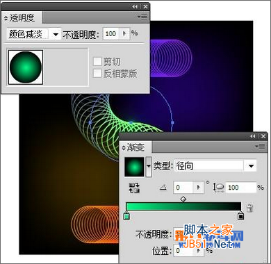 创建一个圆圈,做一个径向渐变填充,然后再应用"透明度"面板的颜色减淡混合模式,给画面增加空间感。