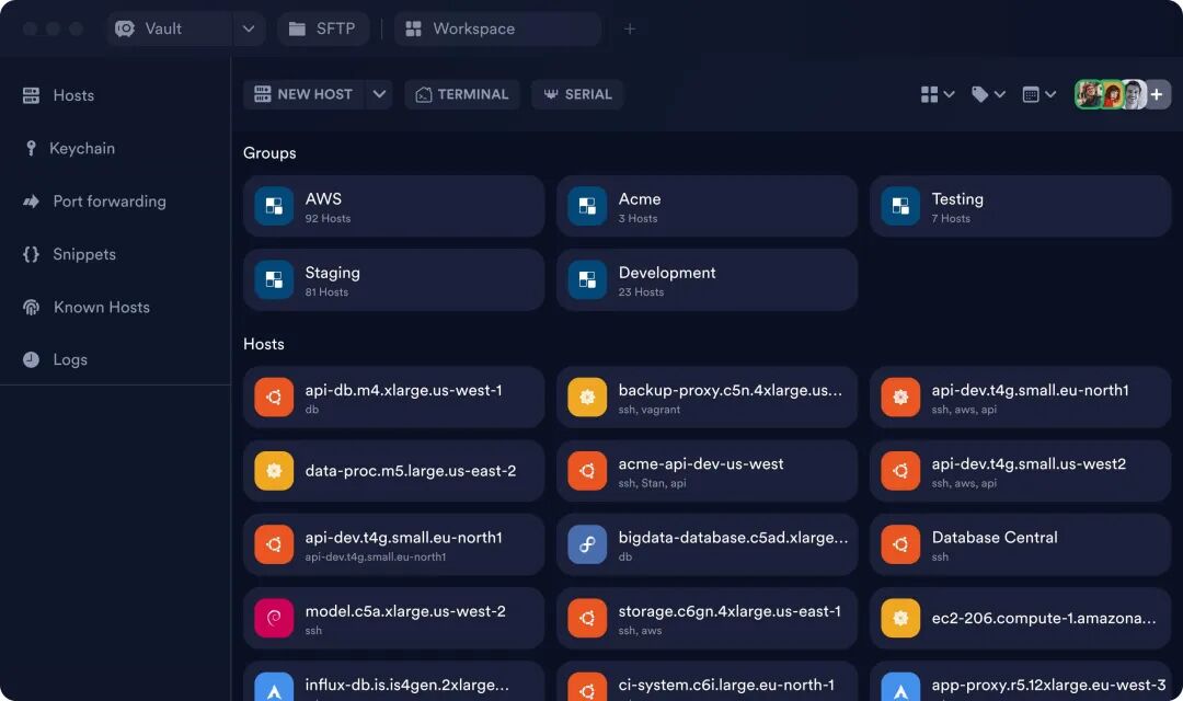 它采用简洁现代的图形界面管理主机与会话,支持 SSH、Mosh、SFTP 等协议,提供多标签、分屏、命令片段、端口转发等实用功能,最大亮点是端到端加密云同步,可在多设备间无缝同步连接信息,非常适合经常切换设备的个人和小团队。