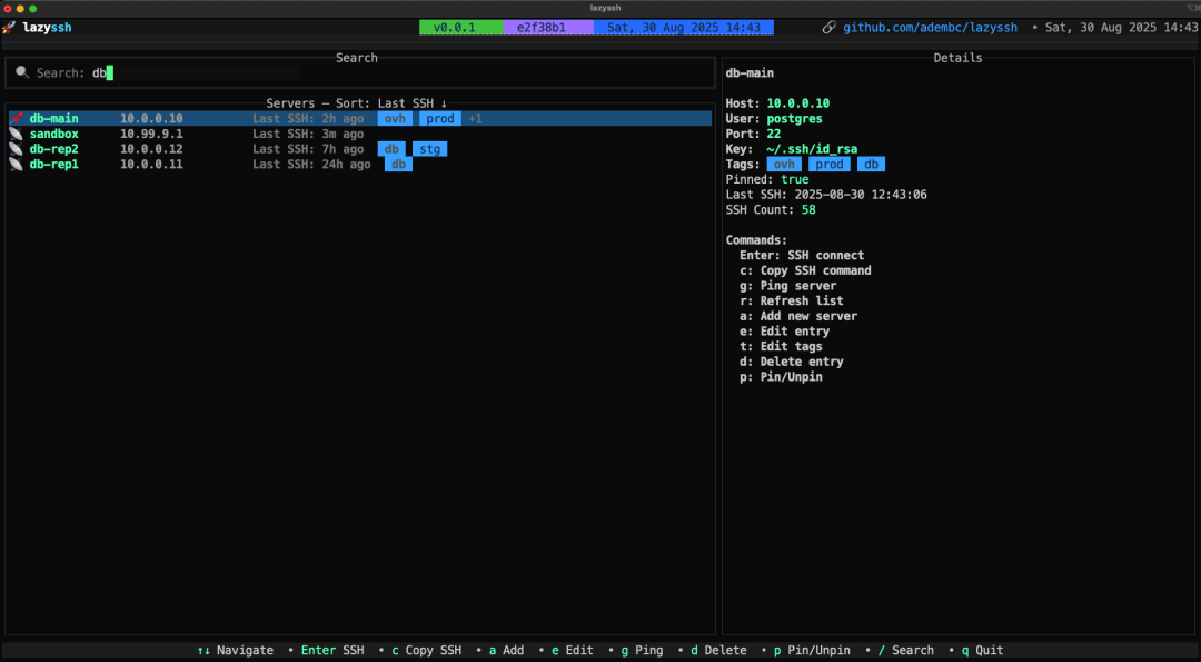 LazySSH 是一款纯终端界面、轻量高效的 SSH 管理器,由 Go 语言编写,无需图形界面,直接读取并管理系统 ~/.ssh/config 主机配置。它提供模糊搜索、一键连接、快速编辑、端口转发等操作,全程键盘驱动,极简流畅,专门为重度命令行用户、Vim 党、运维极客打造。