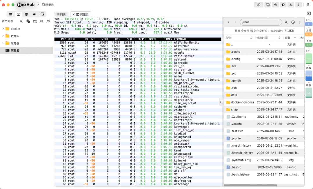 HexHub 是一款国产开源一站式开发运维工具,跨 Windows、macOS、Linux 平台,将 SSH/SFTP 远程、数据库管理、Docker 管理三大核心功能深度整合。支持跳板机、ZMODEM 高速传输、多标签广播、常见数据库可视化操作与远程容器管理,主打 “一个工具顶三个”,减少频繁切换软件,适合全栈开发者与运维人员。