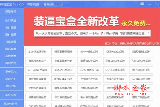 装逼宝盒是款强大的装x图片制作工具。装逼宝盒为用户提供了支付宝、微信、腾讯、游戏、网银等等的业务截图生成,有了它你就不需要在网上找寻各种装x软件了...