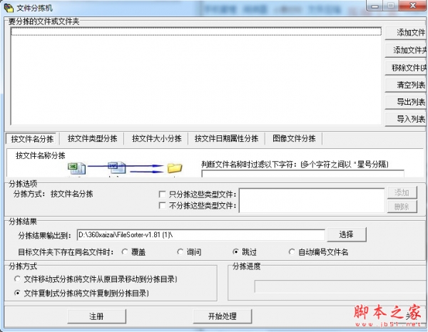 文件分拣机是一个文件分拣、归类工具,可根据文件名称把名称相同或相近(通过设置过滤条件)的文件批量复制或移动到相应的文件夹中...