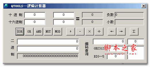 QTOOLS逻辑计算器是一款绿色免费的字符编码转换计算的工具。软件功能强大,能够快速解决逻辑运算问题。包含了16进制输入、2进制输入、小数显示、字符、汉字编码查询、BIG5码和GB2312码转换的功能!极大的方便了编程人员,提高了编程的效率,是编程人员的好帮手...