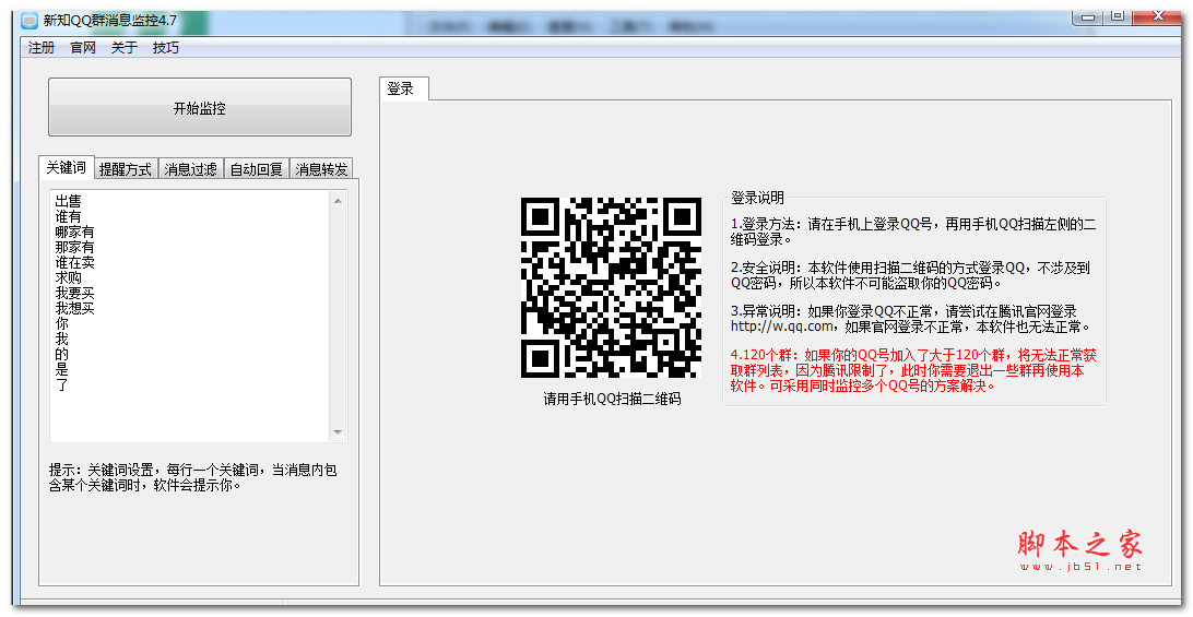 新知QQ群消息监控软件能实时监控QQ群的所有消息,判断消息内是否有关键词出现,如果有则提醒用户...