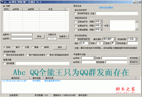 AbcQQ群发营销推广全能王是一款基于QQ协议开发完成,将全自动批量qq消息群发、全自动批量按条件添加好友、全自动批量加qq群、全自动批量发送qq群消息、全自动批量修改qq签名、等功能集于一身的QQ群发营销推广工具...