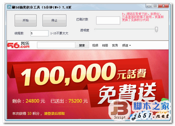 刷56抽奖积分工具是一款作弊刷56积分换话费,哈哈,亲们有福了,5分钟可以刷1W以上积分啊,嘿嘿,亲们也知道积分多了可以干嘛,我想你们比我更懂哦!...