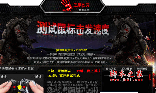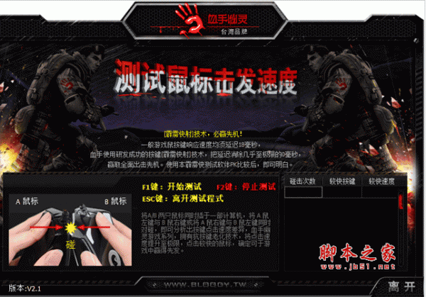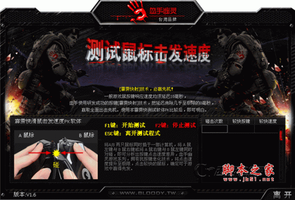 很简单的一款测试工具,测试鼠标击发速度将A/B两只鼠标同时插于一部计算机,将A鼠左键与B鼠右键或将A鼠右键与B鼠左键同时对碰,即可分析出按键点击速度差异,血手幽灵游戏系列...