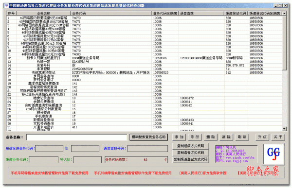 移动业务发展登记代码查询器软件专门为移动通信店定制的业务办理代码查询软件解决了所有的问题,可以任意模糊查询、任意添加办理的代码、任意修改以及任意删除等功能...