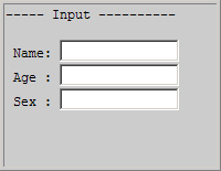 <?xml version="1.0"?> <!DOCTYPE wml PUBLIC "-//WAPFORUM//DTD WML 1.1//EN" "http://www.wapforum.org/DTD/wml_1.1.xml"> <wml> <card title="Input"> <p> Name: <input name="Name" size="15"/><br/> Age: <input name="Age" size="15" format="*N"/><br/> Sex: <input name="Sex" size="15"/> </p> </card> </wml>
