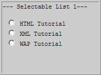 <?xml version="1.0"?> <!DOCTYPE wml PUBLIC "-//WAPFORUM//DTD WML 1.1//EN" "http://www.wapforum.org/DTD/wml_1.1.xml"> <wml> <card title="Selectable List 1"> <p> <select> <option value="htm">HTML Tutorial</option> <option value="xml">XML Tutorial</option> <option value="wap">WAP Tutorial</option> </select> </p> </card> </wml>
