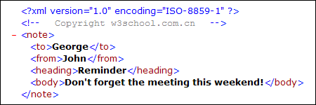 打开 XML 文件 - XML 文档将显示为代码颜色化的根以及子元素。通过点击元素左侧的加号或减号,可以展开或收起元素的结构。如需查看不带有 + 和 - 符号的源代码,请从浏览器菜单中选择“查看源代码”。