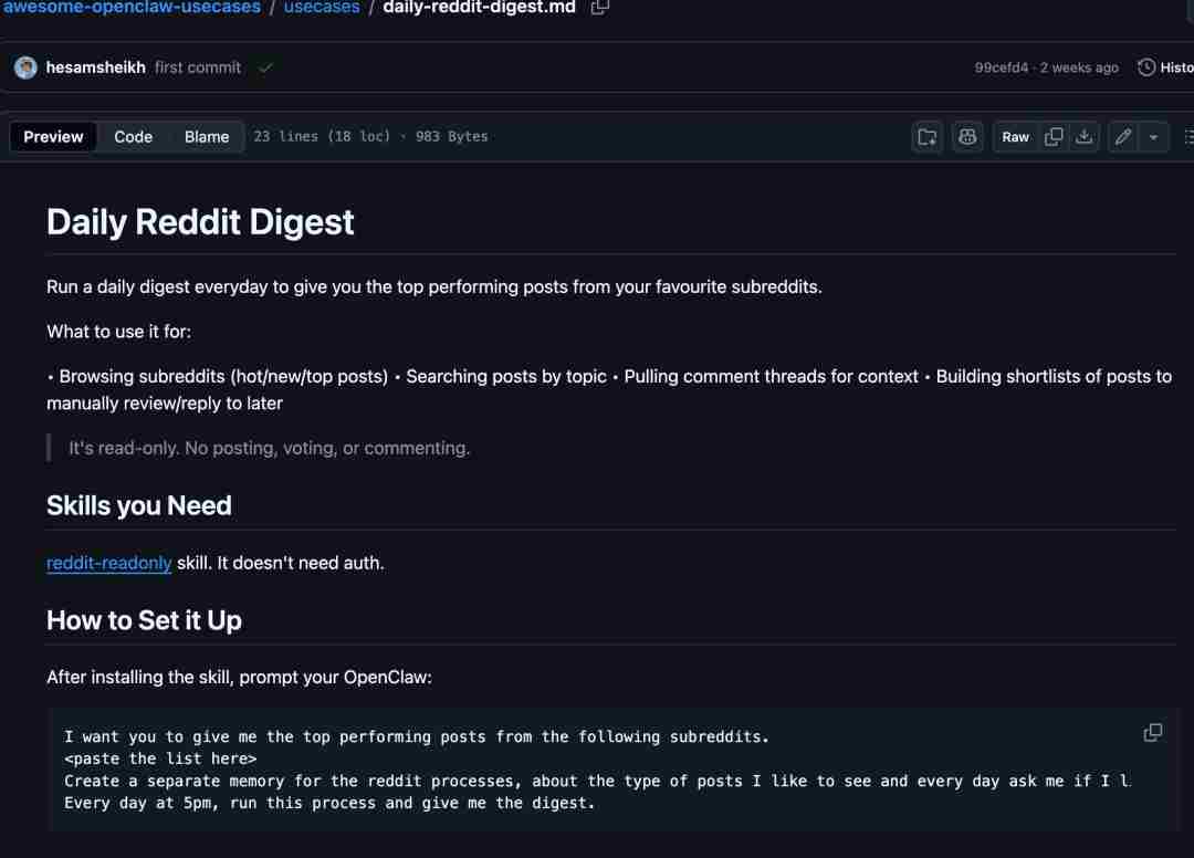 我们可以打开 daily-reddit-digest.md 文件,它实现 OpenClaw 自动生成个性化 Reddit 每日精选摘要: