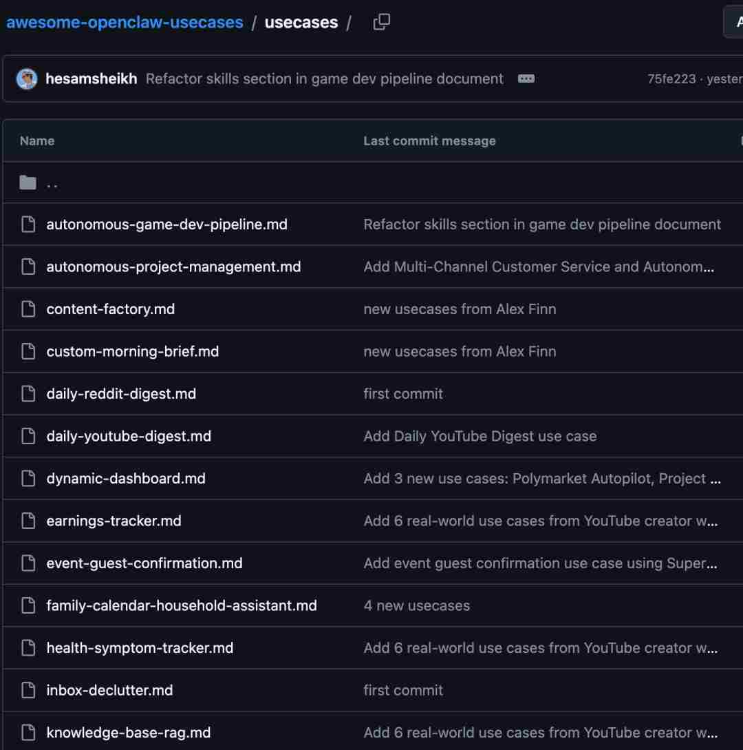 打开这个开源项目https://github.com/hesamsheikh/awesome-openclaw-usecases ,我们可以看到 usecases 下有很多 .md文件: