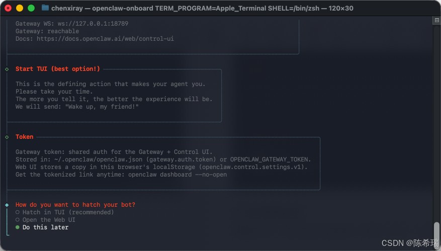 | openclaw tui | 启动OpenClaw文本用户界面(终端交互模式) | 直接输入即可进入交互界面 |