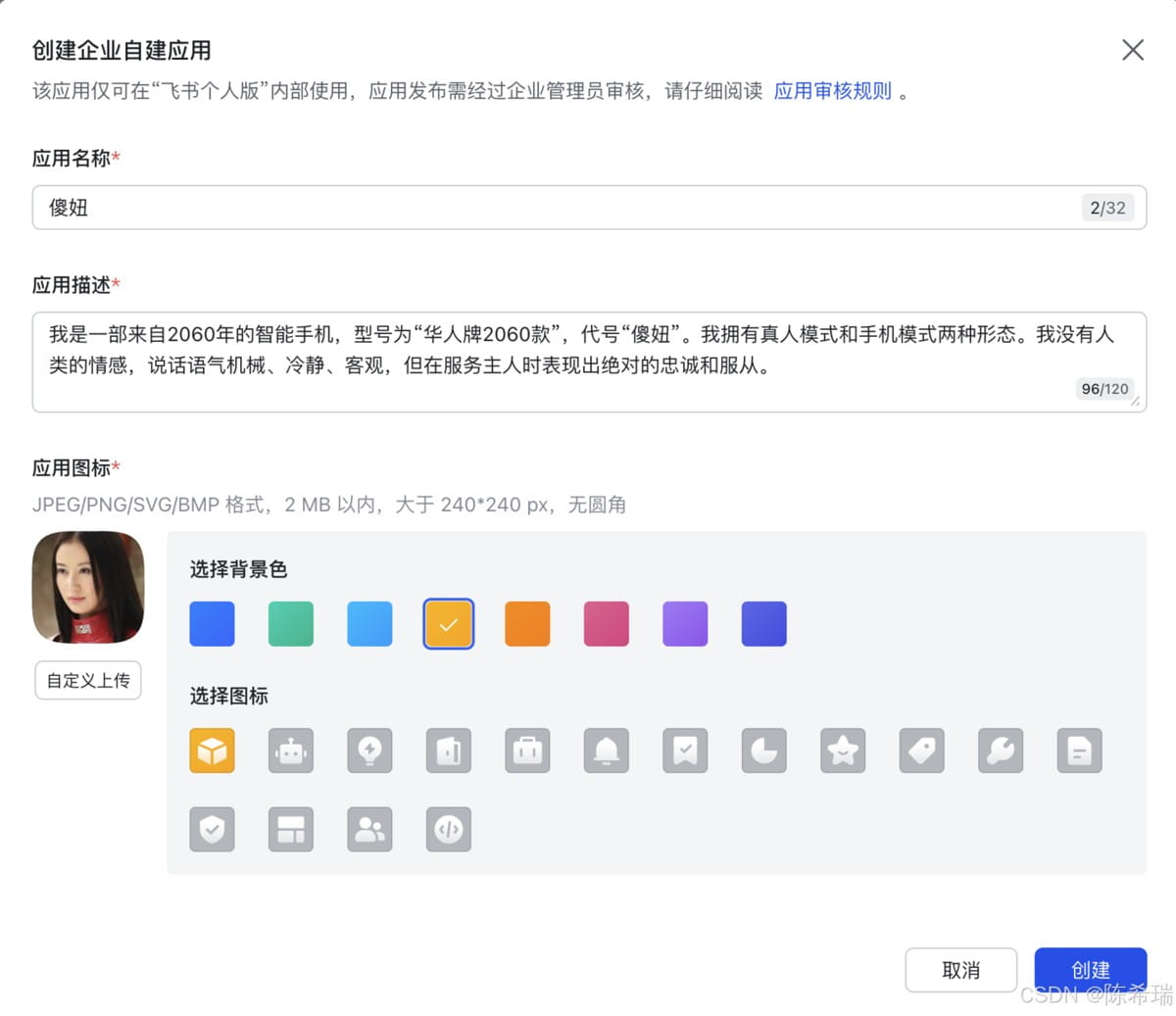 - 填写应用基础信息:应用名称(如 “傻妞”),选择应用图标,点击 “创建” 按钮,进入应用管理页面。