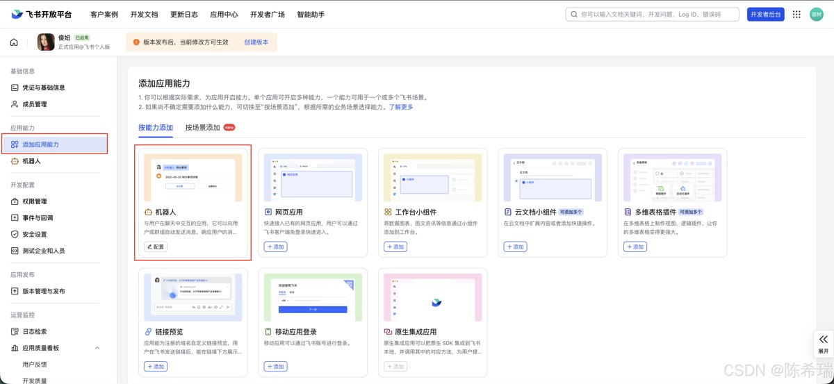 添加机器人能力:在应用管理页左侧导航栏,找到并点击 “添加应用能力”,在弹出的列表中选择 “机器人”,点击 “添加”。