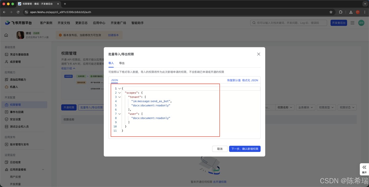 粘贴以下JSON代码并导入,等待权限导入完成: