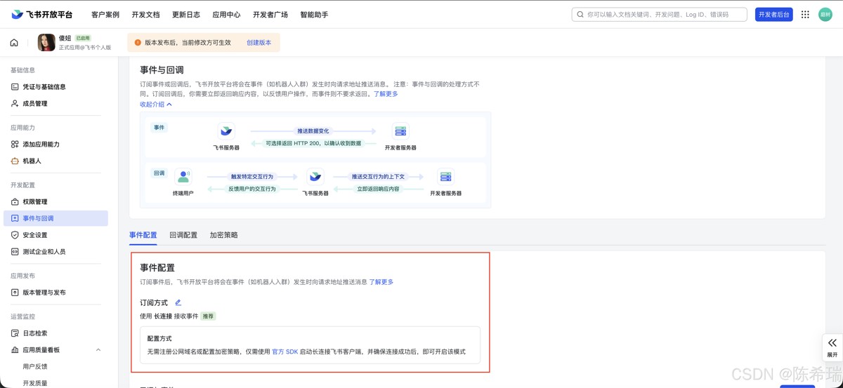 回调配置:订阅方式选择 “使用长连接”,无需填写其他地址,配置自动生效。