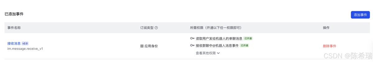 添加事件:点击页面中的 “添加事件”,在弹出的事件列表中,选择 “消息与群组” 分类,勾选 “接收消息”,点击 “确定”,完成事件订阅。