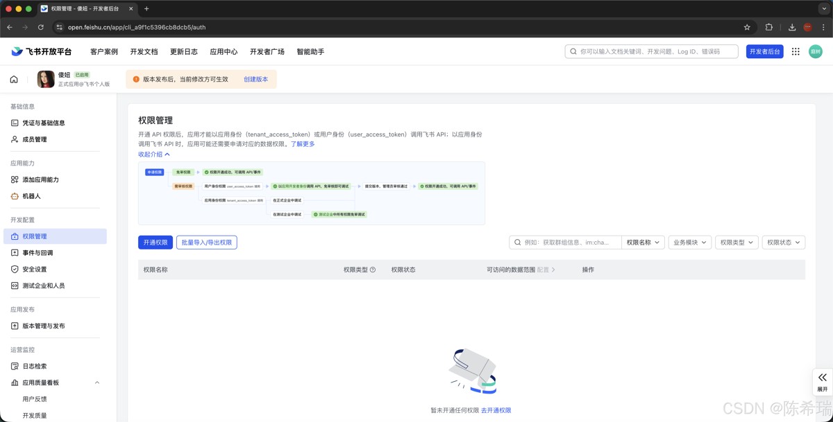 - 在飞书应用管理页,点击进入 “版本管理与发布”