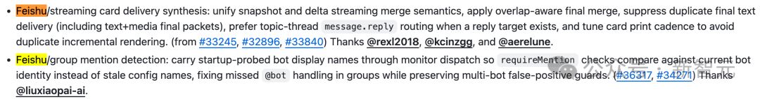 - 渠道层面,覆盖了Telegram草稿流重复、Discord断连死机、Slack消息路由、飞书Webhook兼容性、WhatsApp自聊天前缀注入、iOS/macOS端的各种边界情况。