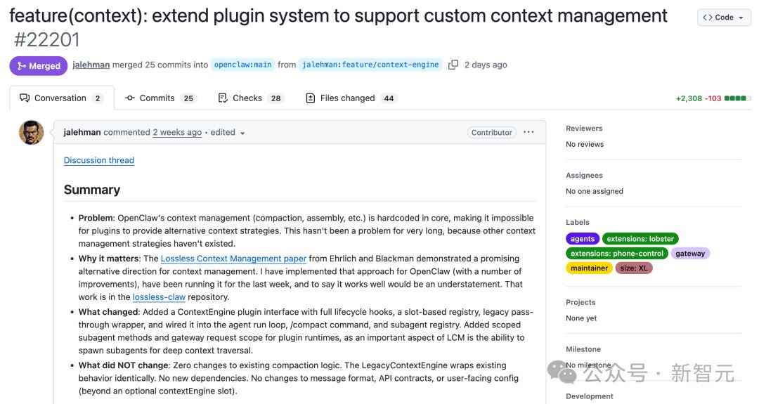 翻译成人话:开发者现在可以在不修改OpenClaw核心代码的情况下,完全自定义上下文的处理逻辑。你想用RAG?可以。想做激进压缩?随意。想让不同子任务拥有隔离的记忆空间?接口都给你准备好了。