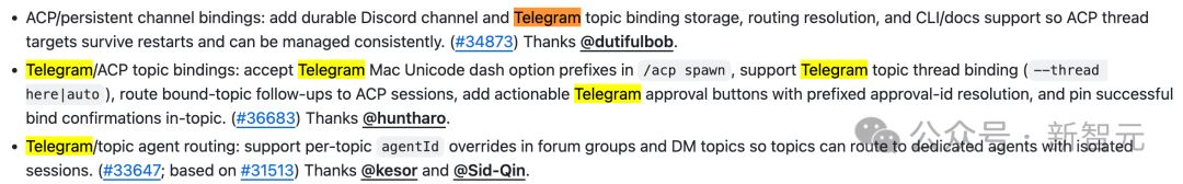 Discord端修复了断连后无法恢复的死机问题,优化了频道解析和机器人心跳检测。Telegram端新增了主题级别(Topic)的智能体路由隔离——这意味着你可以在同一个Telegram群组的不同主题里,分别运行不同的AI智能体,互不干扰。