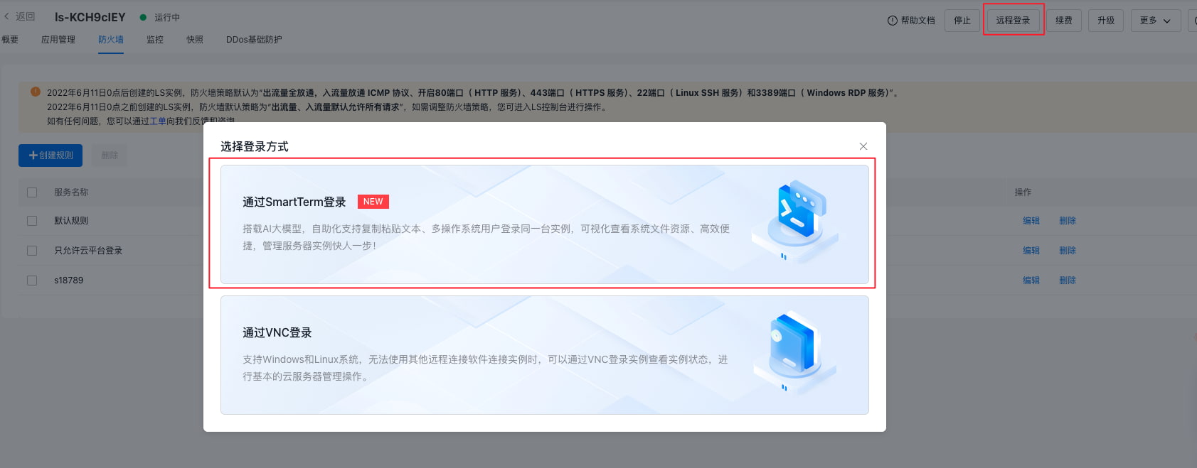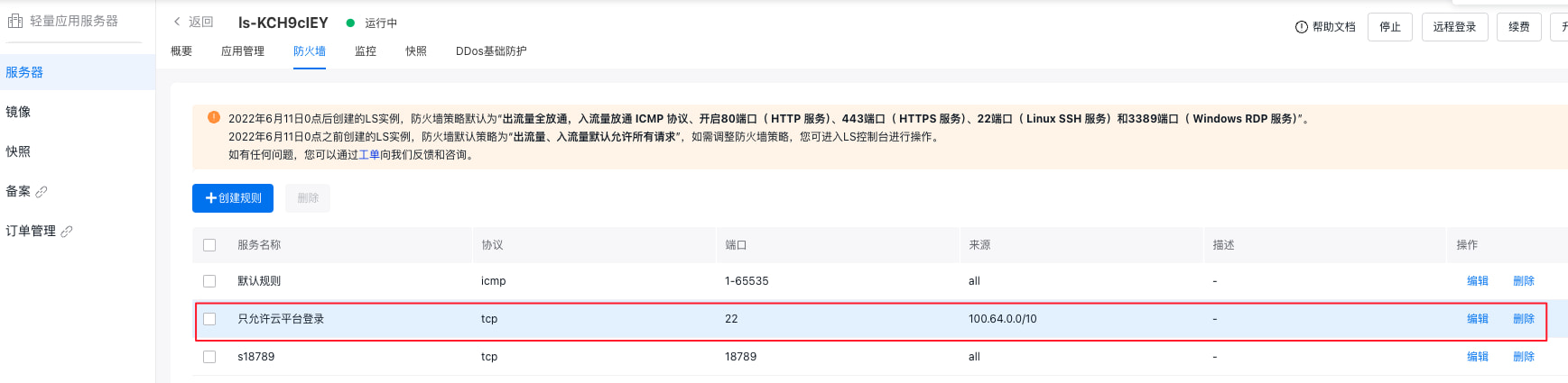 在实例的【防火墙】设置22端口的访问源为 100.64.0.0/10,便只允许云平台的SmartTerm或者VNC登录