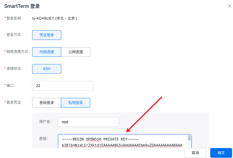 也可以使用SmartTerm通过私钥登录,将上面生成的 id_rsa 的内容复制到密钥框