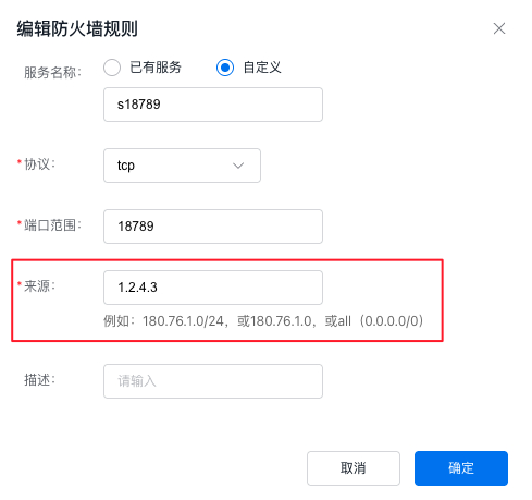 - 步骤三:设置访问源IP白名单,将您的访问源IP填写到【来源】选项中