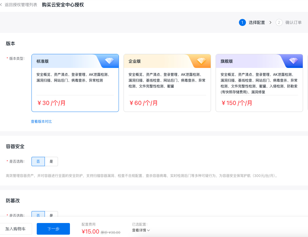 6、安全防护能力:建议开启云安全中心标准版或以上的防护版本,具备云主机环境后门、病毒查杀等基础安全防护能力