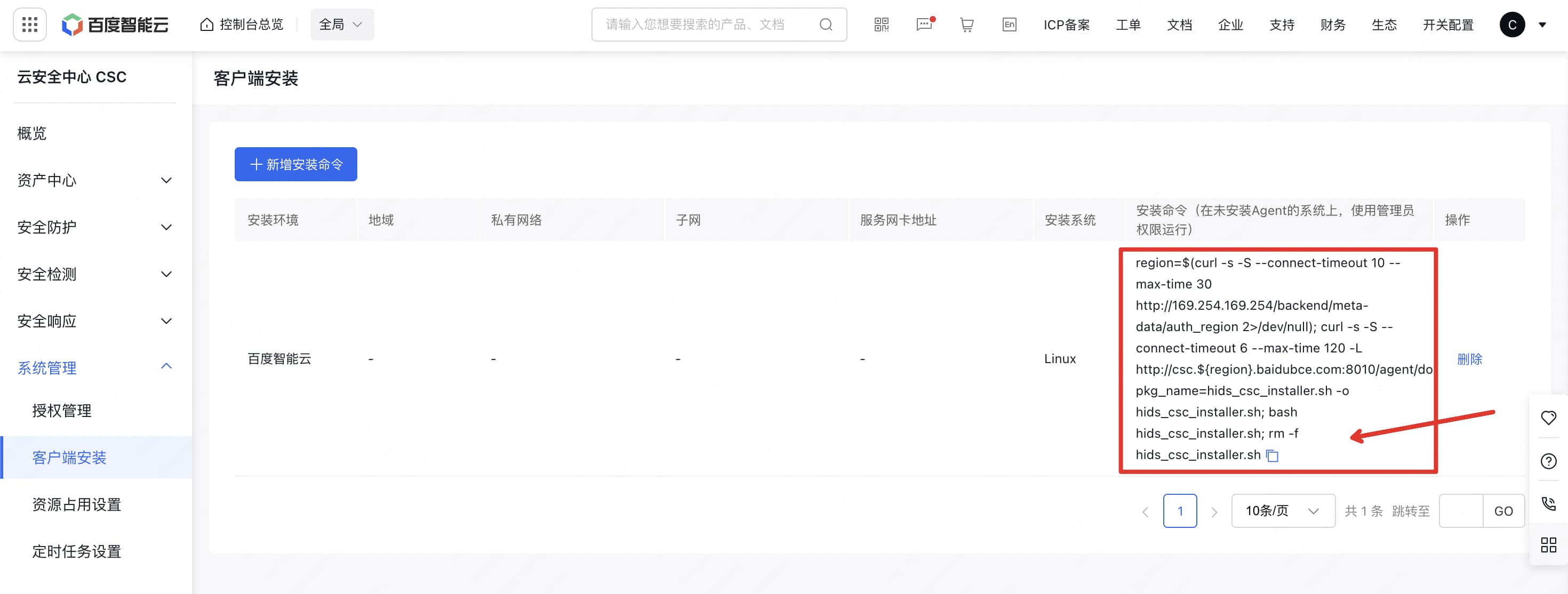 - 步骤二:到云安全中心的客户端安装选项下,复制客户端安装命令,然后到轻量服务器上运行安装命令