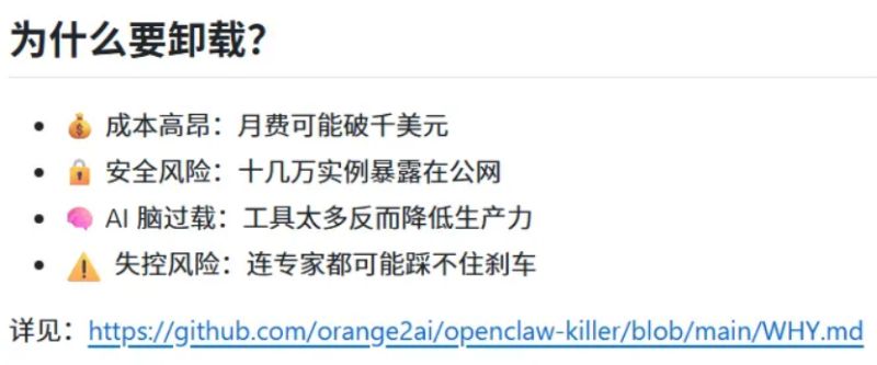 安装后,系统中有很多东西需要卸载,但卸载OpenClaw不是点几下鼠标就完事,需要至少5个复杂步骤:停服务、清配置、删状态、处理多profile...在Github上有一个开源项目,把这套流程打包好了,写成完全开源免费的工具——OpenClaw Killer。